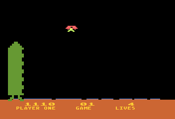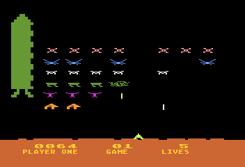Besides Star Raiders, the only game we had for a while. For a small game, it sure took forever and a day to load off cassette! Rocklan's Deluxe Invaders was more like the real thing...but the sound when you creamed the guy at the top was sure satisfying. |